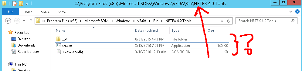 When you get to that folder you’ll probably see what I saw above…no sgen.exe file. This is what the problem is. MSBuild is looking for sgen.exe in this location and can’t find it. How do you fix that? You could change registry settings, but there is risk in that…and I told you earlier that you wouldn’t have to. Another option is to find a copy of sgen.exe and put it in that folder. From what I can tell sgen.exe is pretty stand alone and any version you find should work. I went to a slightly newer SDK version on my machine and copied the file from there.